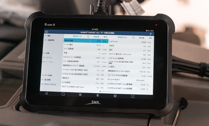 OBD診断機(トラック・バス6社対応)を使用しています。幅広い車両に対応しており細部まで診断可能です。常に最新版にアップデートしているので、あらゆる状況を正確に把握できます。また、OBD診断機と専用薬剤を使用してのDPF(黒煙除去フィルター)の洗浄作業にも対応しています。
